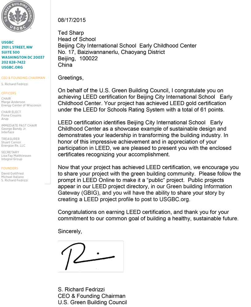 我公司承建的樂成幼兒園工程,獲得了國際綠色建筑LEED認證金獎,這是截止目前國內(nèi)教育類建筑工程獲得LEED認證金獎的兩個項目之一,為獲得綠色建筑認證,我司樂成幼兒園項目付出了艱苦的努力,該認證的獲得也說明我司從技術(shù)實力、管理能力等方面有了長足的進步。同時也對樂成幼兒園項目取得的成績表示祝賀。下圖為LEED金獎證書: