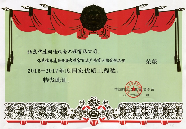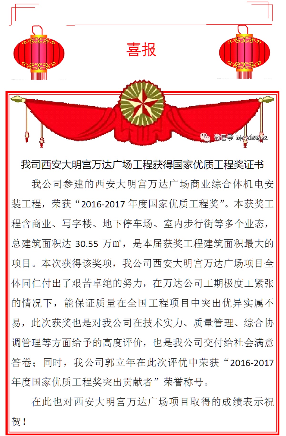 喜訊—我司西安萬達(dá)廣場項目榮獲國家優(yōu)質(zhì)工程獎