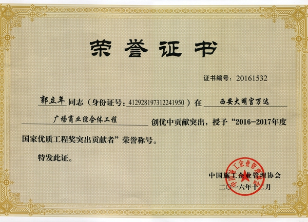 郭立年同志獲得的個人突出貢獻(xiàn)獎證書
